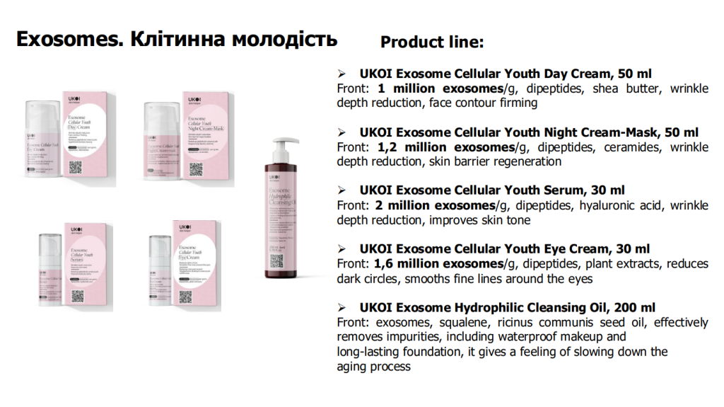 В UKOIвирішили піти далі: об’єднати екзосоми з інтелектуальними активами нового покоління, щоб створити догляд, який працює комплексно, глибоко й розумно.Тому в лінійці Exosome Cellular Youth народилася унікальна синергія: