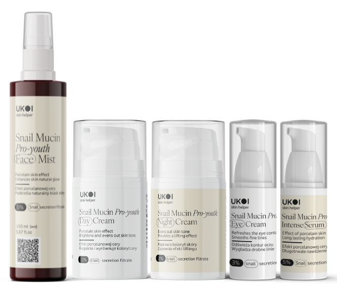 UKOI Snail Mucin Pro‑Youth з муцином равлика – це комплексна серія для догляду за шкірою обличчя, розроблена для глибокого зволоження, відновлення та м’якого антивікового ефекту. Основний компонент – фільтрат слизу равлика – сприяє покращенню пружності шкіри, вирівнює її тон, допомагає зменшити прояв дрібних зморшок і підтримує здоровий стан епідермісу.