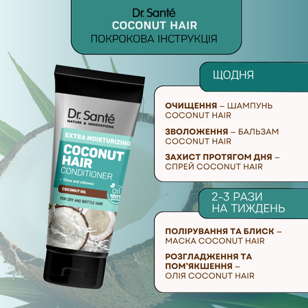 Набір Dr.Sante Coconut Hair Екстразволоження волосся — розроблений для інтенсивного зволоження, живлення та відновлення сухого, ламкого та пошкодженого волосся. Висока концентрація кокосової олії забезпечує глибоке живлення, відновлює структуру волосся зсередини та захищає його від пересушування.