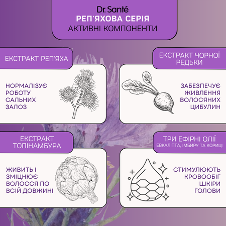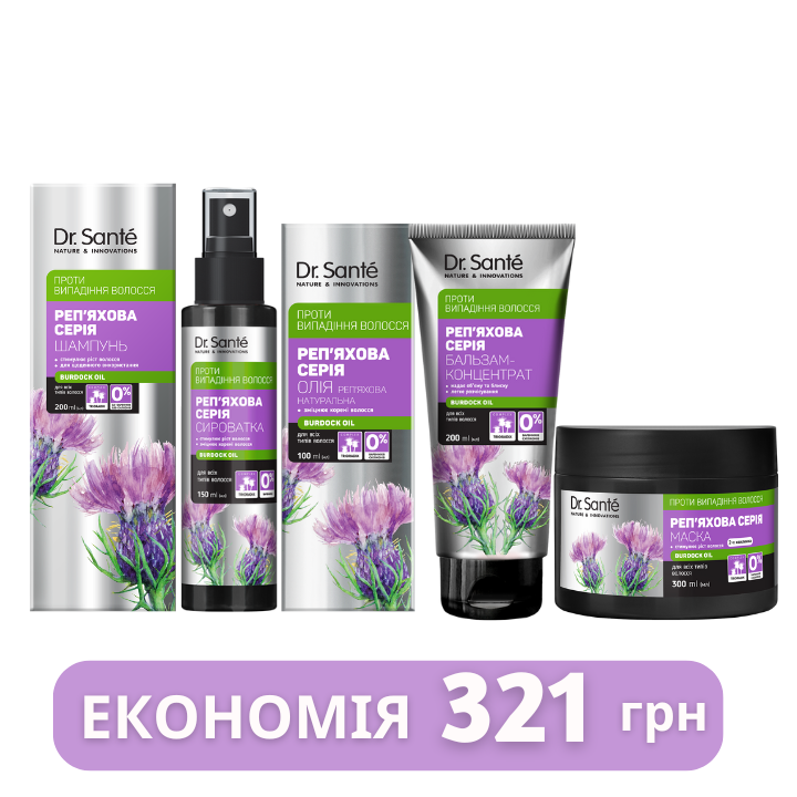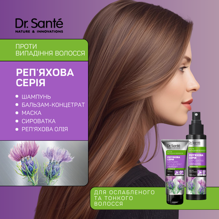 Набір Dr.Sante Реп’яхова серія проти випадіння волосся розроблений для зміцнення волосяних цибулин, стимуляції росту волосся та зменшення його випадіння. Завдяки комплексній дії натуральних екстрактів і активних компонентів засоби глибоко живлять, покращують мікроциркуляцію шкіри голови, стимулюють ріст нових волосків та зміцнюють структуру по всій довжині. Набір ідеально підходить для ослабленого, ламкого та тьмяного волосся.