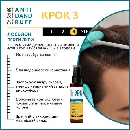 Лосьйон проти лупи для щоденного використання, 150 мл — ультрам’який засіб без змивання. Заспокоює шкіру, зменшує сухість і лущення, допомагає контролювати прояви лупи між миттями голови.