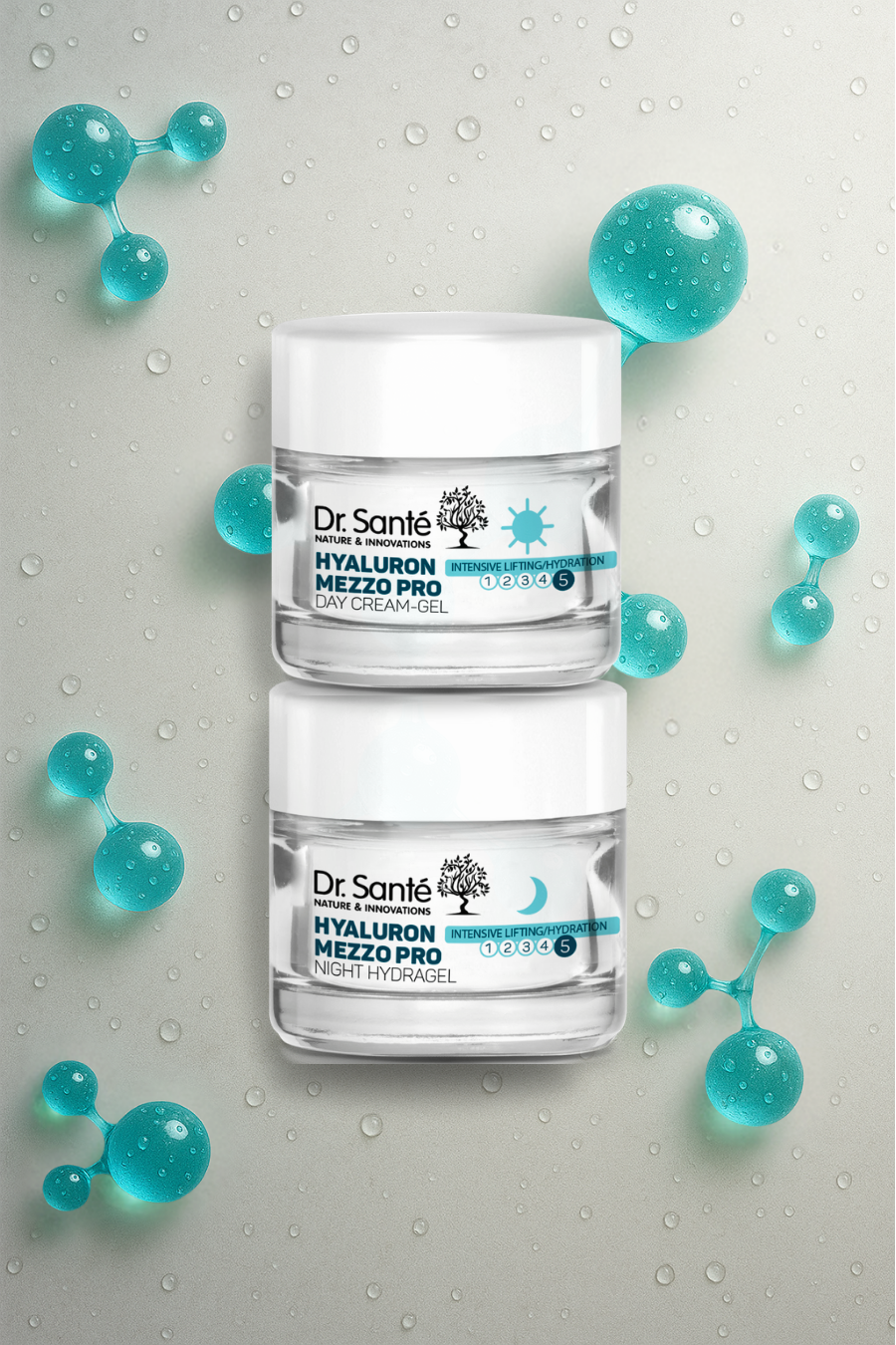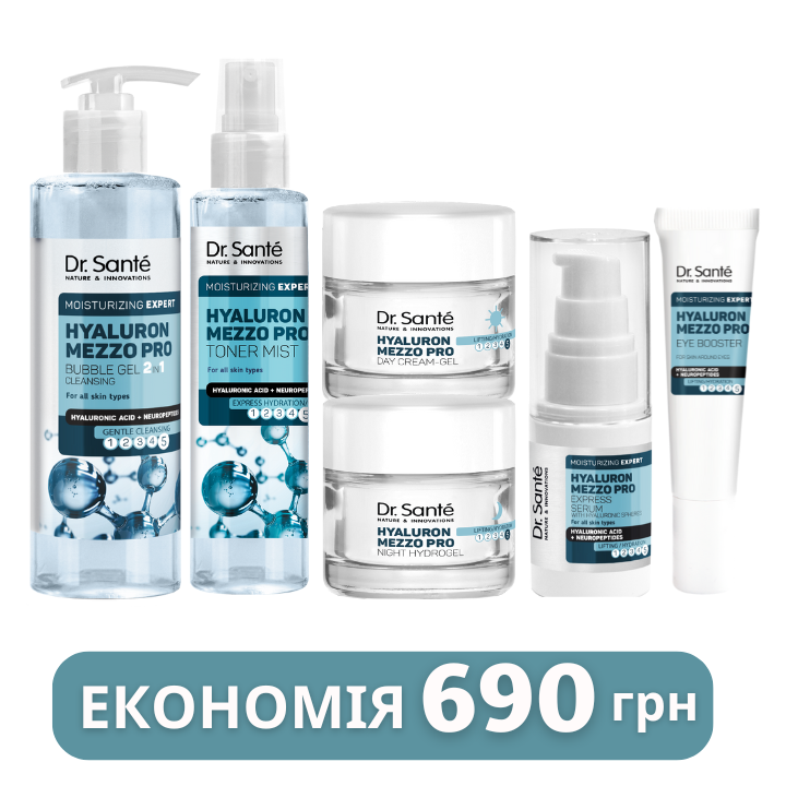 Набір Dr.Sante Hyaluron Mezzo Pro — інноваційна лінійка засобів, яка забезпечує багаторівневе зволоження та боротьбу з першими ознаками старіння. Завдяки унікальній формулі з гіалуроновою кислотою, нейропептидами та пребіотиками, шкіра отримує інтенсивний догляд, стає гладкою, пружною та сяючою.Що дає регулярне використання набору: