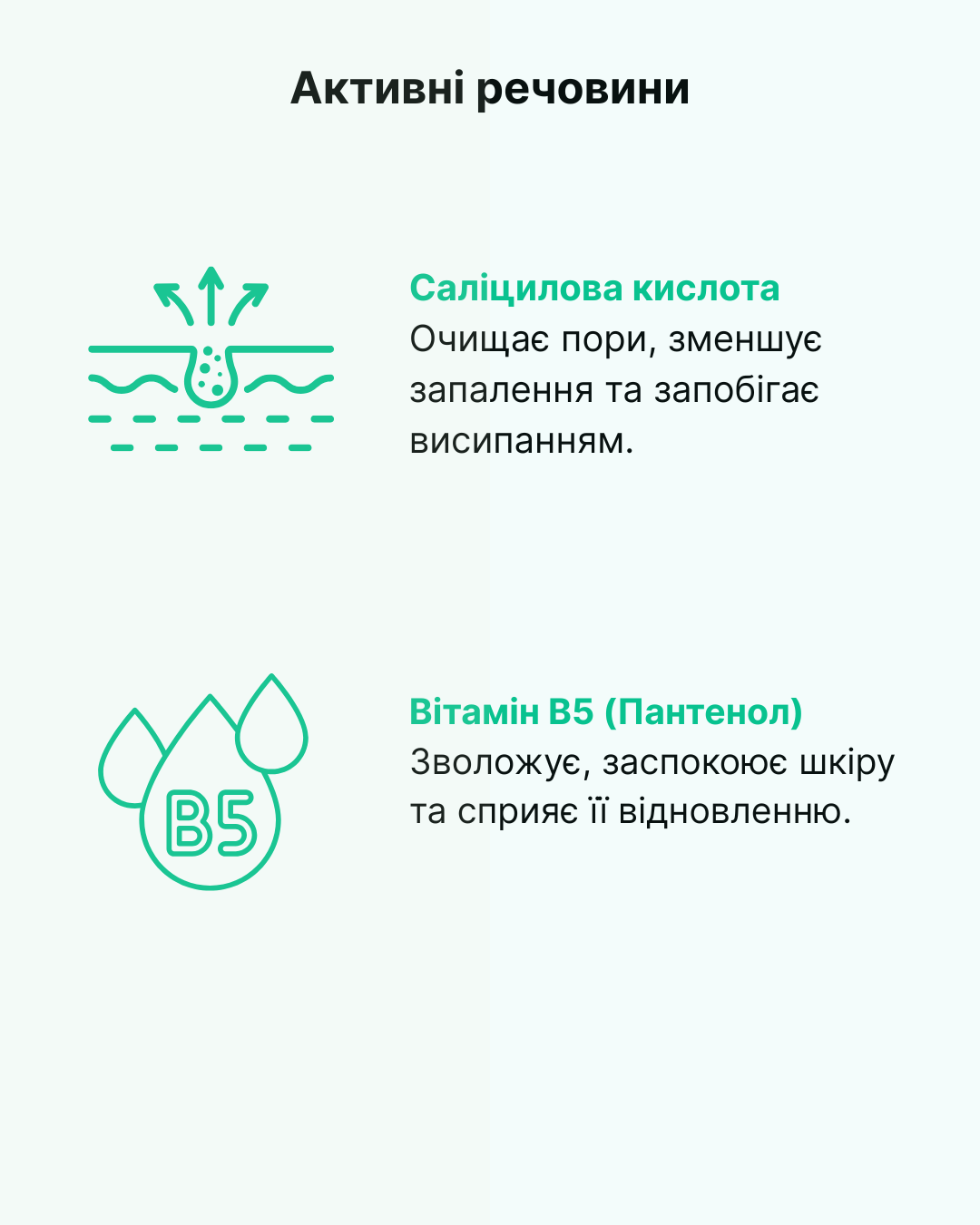 Синергія активних компонентів: саліцилова кислота та вітамін B5 забезпечують контроль себуму, очищення пор та підтримку балансу шкіри.