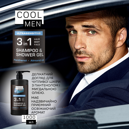 Гель-шампунь 3в1 Cool Men Ultrasensitive, 1000 мл — делікатний догляд для чутливої шкіри з пантенолом і мигдальною олією.