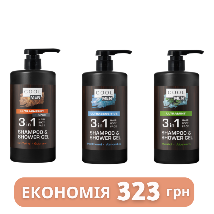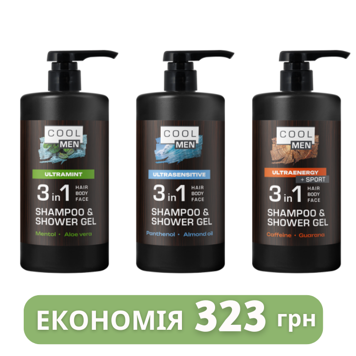 Гель-шампунь 3в1 Cool Men Ultraenergy, 1000 мл — очищує тіло, волосся та обличчя, заряджає енергією, має тонізуючу дію завдяки кофеїну та гуарані.