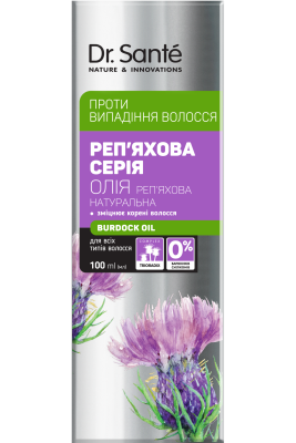 Натуральна реп'яхова олія - це ефективний і дієвий засіб для вирішення проблем з волоссям: його випадінням, ослабленістью, тьмяністю. Вона зміцнює корені, відновлює, активізує ріст і в цілому сприятливо впливає на здоров'я волосся. А олія Dr. Santé додатково збагачена активними компонентами, які в рази підсилюють її дію.