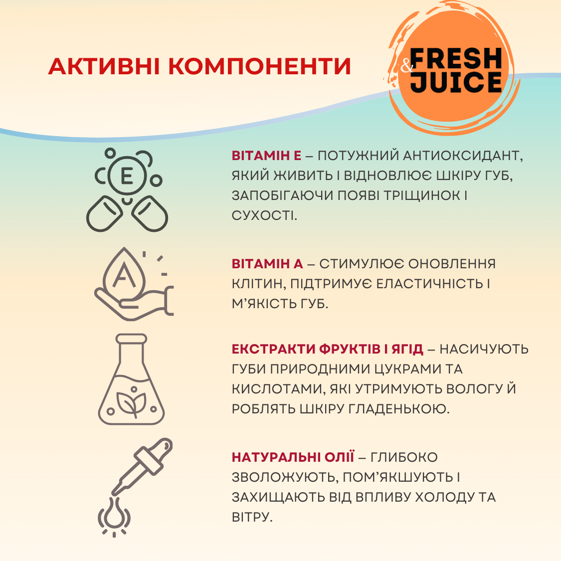 У набір входить 6 різних помад Fresh Juice Fruity Lip Care по 5 штук — разом 30 гігієнічних бальзамів для губ із фруктовими ароматами. Лінійка створена для щоденного догляду: помади зволожують, пом’якшують і захищають губи, роблять їх гладкими та доглянутими протягом дня. Формули з вітамінами та натуральними оліями підтримують природний бар’єр шкіри та запобігають сухості.