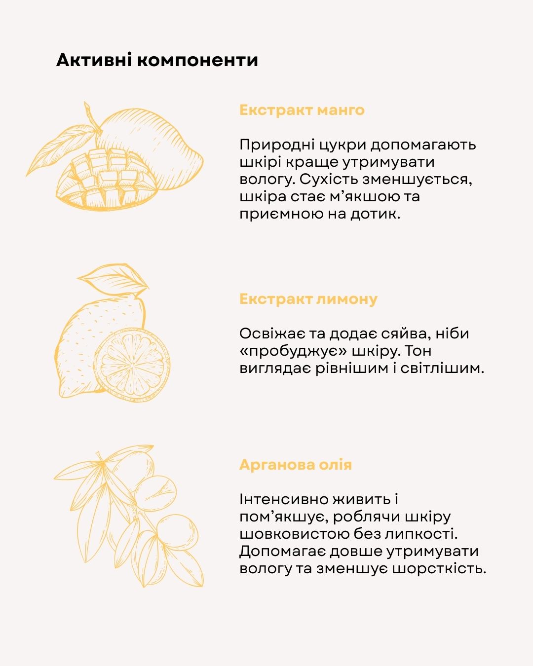 • Освіжає і надає сяйва шкіри за рахунок манго і лимону, роблячи шкіру більш шовковистою.