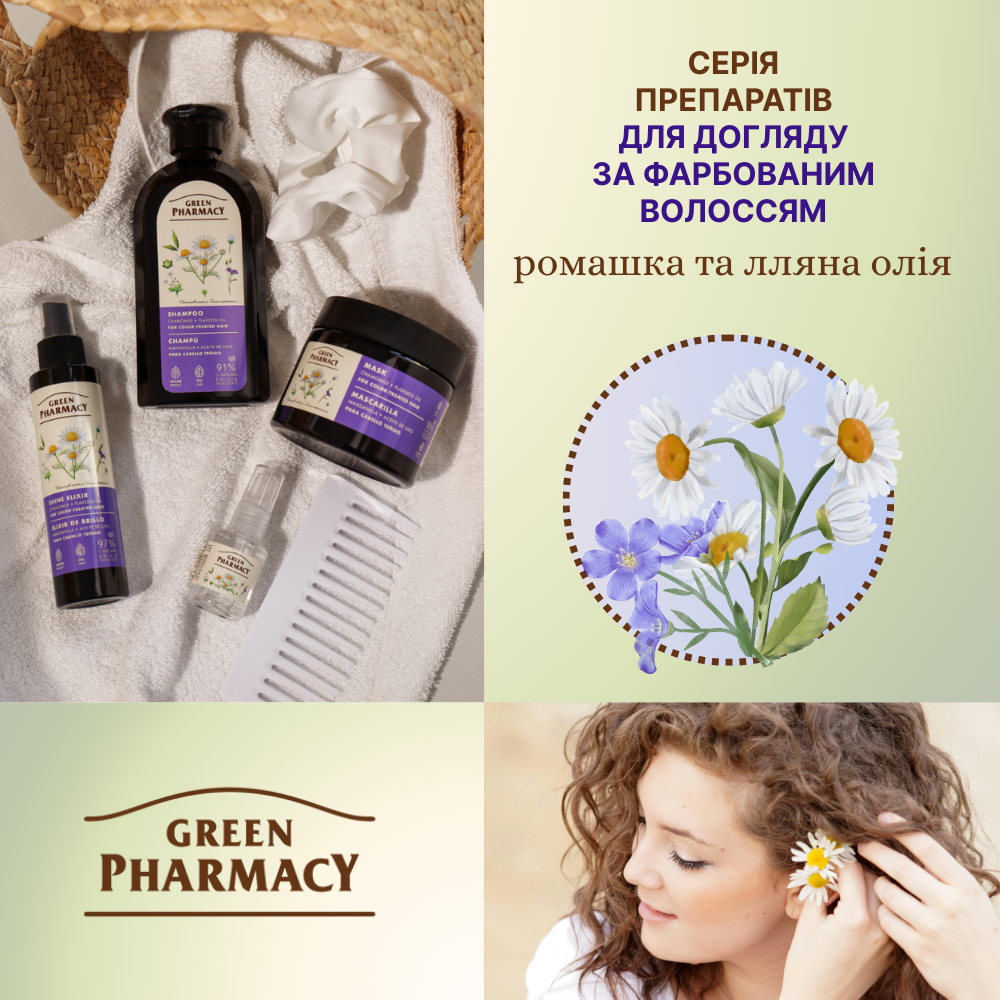 Еліксир для блиску фарбованого волосся Green Pharmacy Ромашка та лляна олія, 150 мл