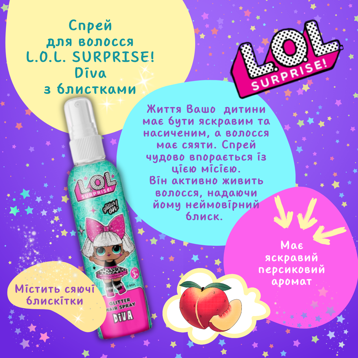 Набір L.O.L. SURPRISE! Сплеш Квін — це яскравий, ароматний та дбайливий щоденний догляд для дівчаток. Продукти ніжно очищують, зволожують і роблять волосся слухняним, а яскраві персонажі перетворюють купання й догляд на справжню гру.
