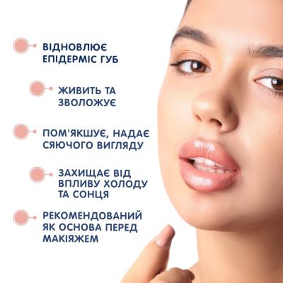 Бальзам для губ — інноваційний засіб, що містить компоненти, призначені для захисту та ревіталізації шкіри губ. Усуває сухість та живить, заспокоює. Відновлює природний захисний бар'єр шкіри губ. Має легку текстуру, швидко поглинається, не залишає липкості, що дозволяє застосовувати його одночасно з декоративною косметикою.Призначений для зовнішнього застосування у вигляді прозорої однорідної маси.